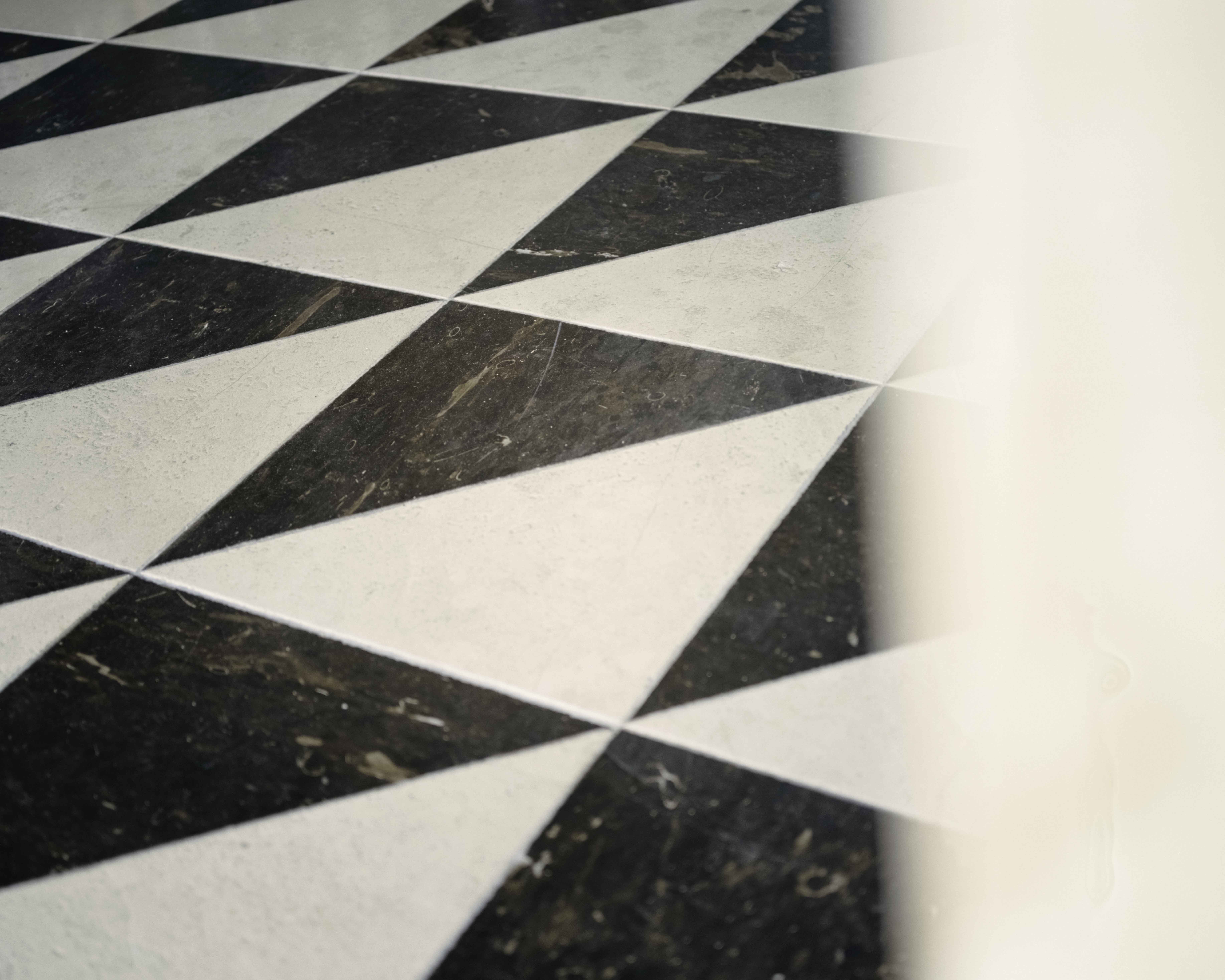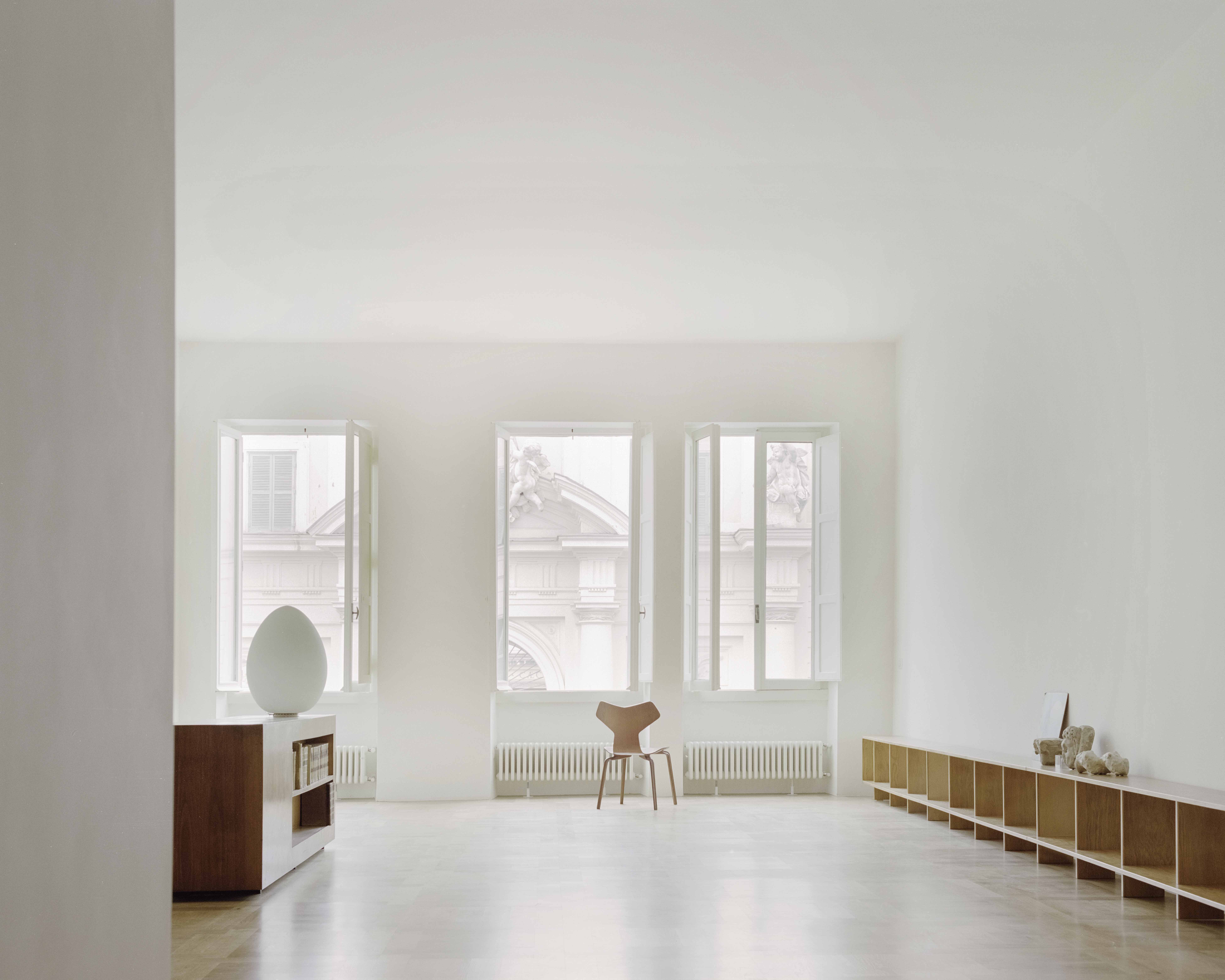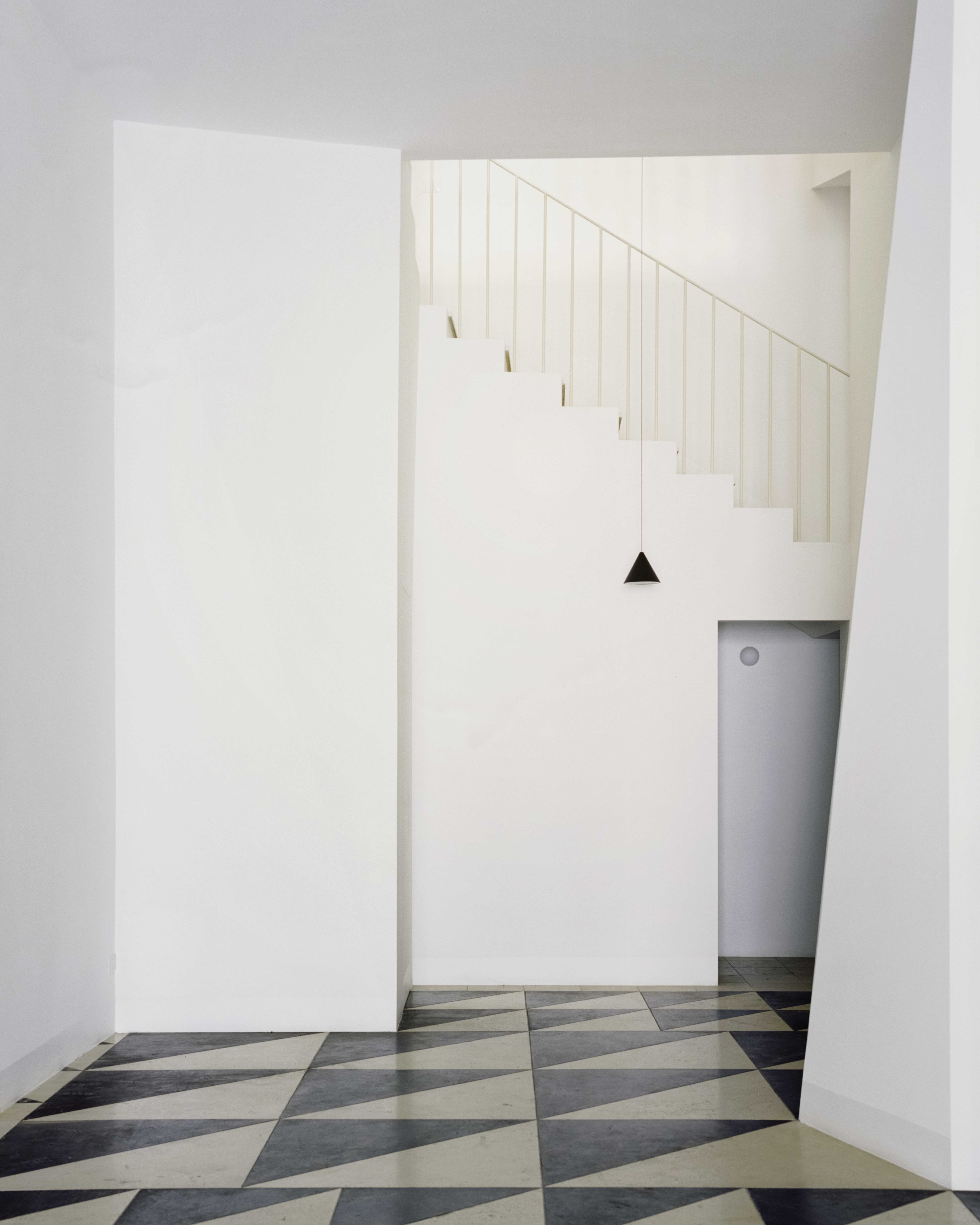 On the ground floor, the bichromatic Timpa Stone flooring changes in size and direction depending on the functional destination suggested by the space. It is inspired by the materials recurring in the basilica complex of Santa Cecilia and by the cobblestones of the square, as well as by the large geometric and polychrome flooring of the Roman period. Geometries and recurring measurements have defined the internal design of the rooms and objects.The geometric structure of the project (sometimes explicit and sometimes hidden) was confronted with the irregularities and inaccuracies of the lot; this has often suggested eccentric connection solutions. On the first floor, one finds a completely free and open space, that entrusts its identity to the spectacular external view through the three windows which form a triptych of the facade of the church in front.