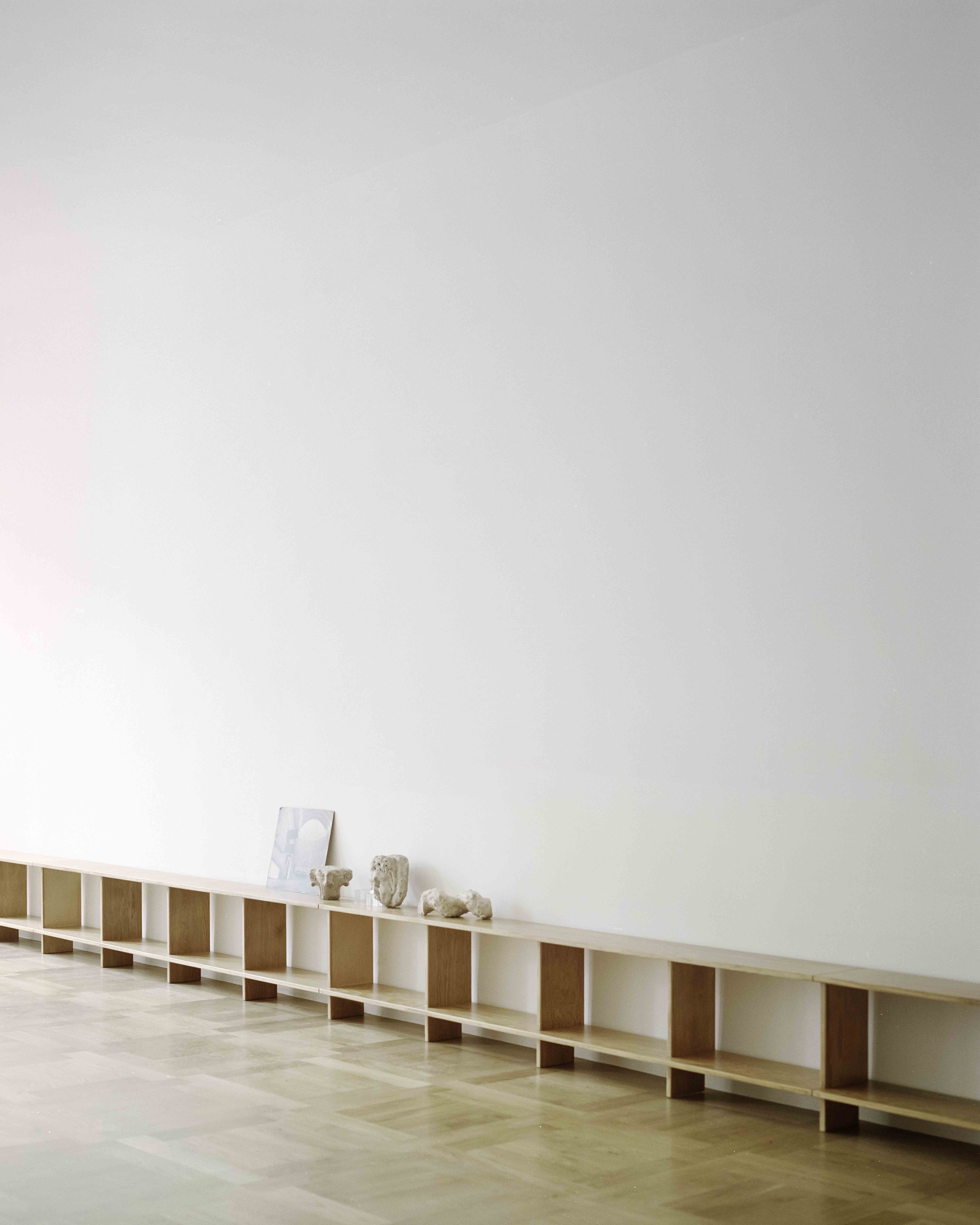 A suspended system of dry-mounted joinery allows wall panels to be replaced and reconfigured. Initially realized in aluminum laminates, the system allows to radically shift the visual identity of the space with each new installation.