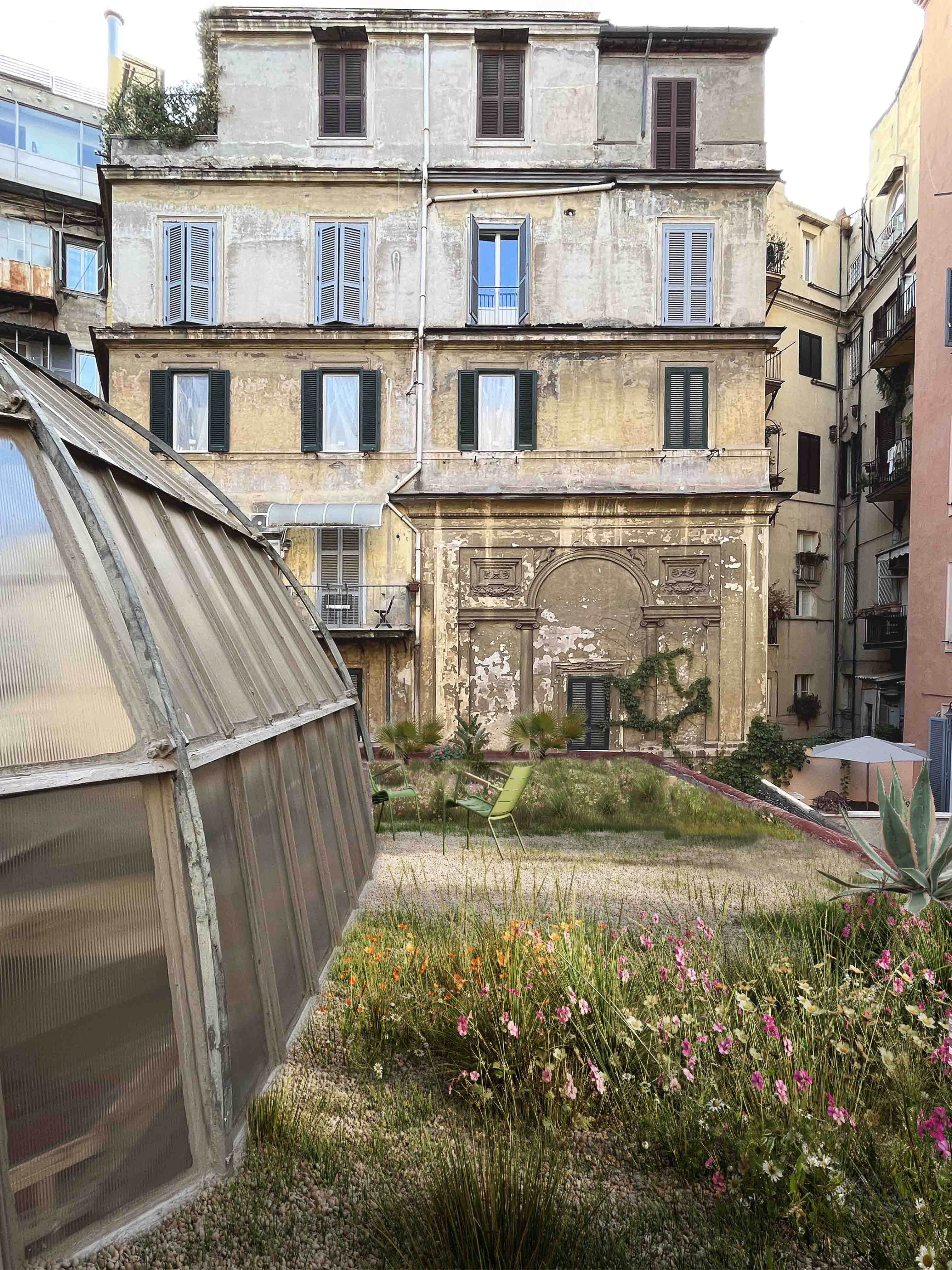 By maximizing drainage areas and permeable organic lands through a system of artificial topographies, it reacts to the heat island phenomenon and contrasts the negative effects of increasing rainfall intensity. The landscape design of the entrance square and the public citrus roof garden draws inspiration from iconic Roman natural sceneries, blending the untamed beauty of romantic parks with the controlled aesthetics of aristocratic Italian gardens.
