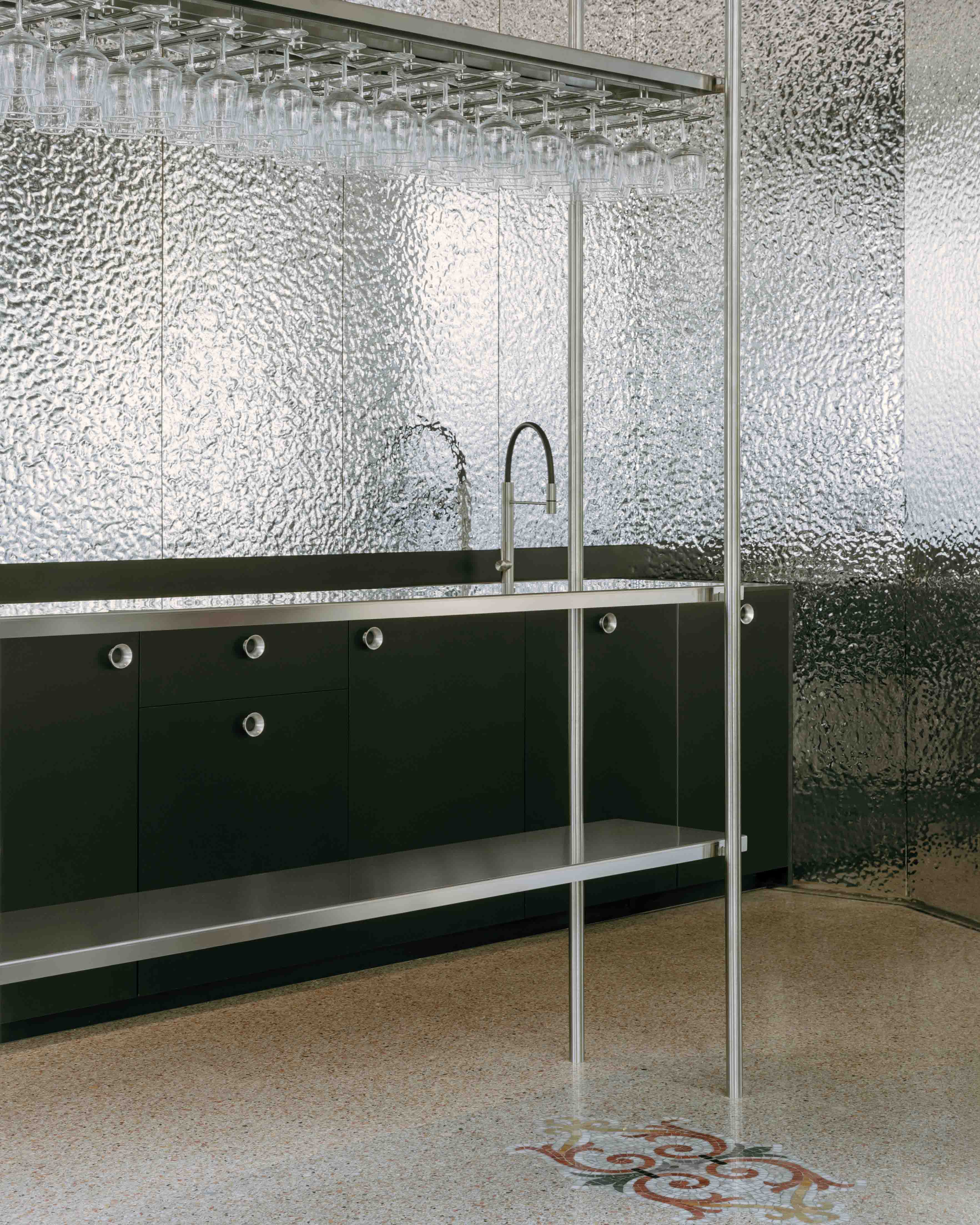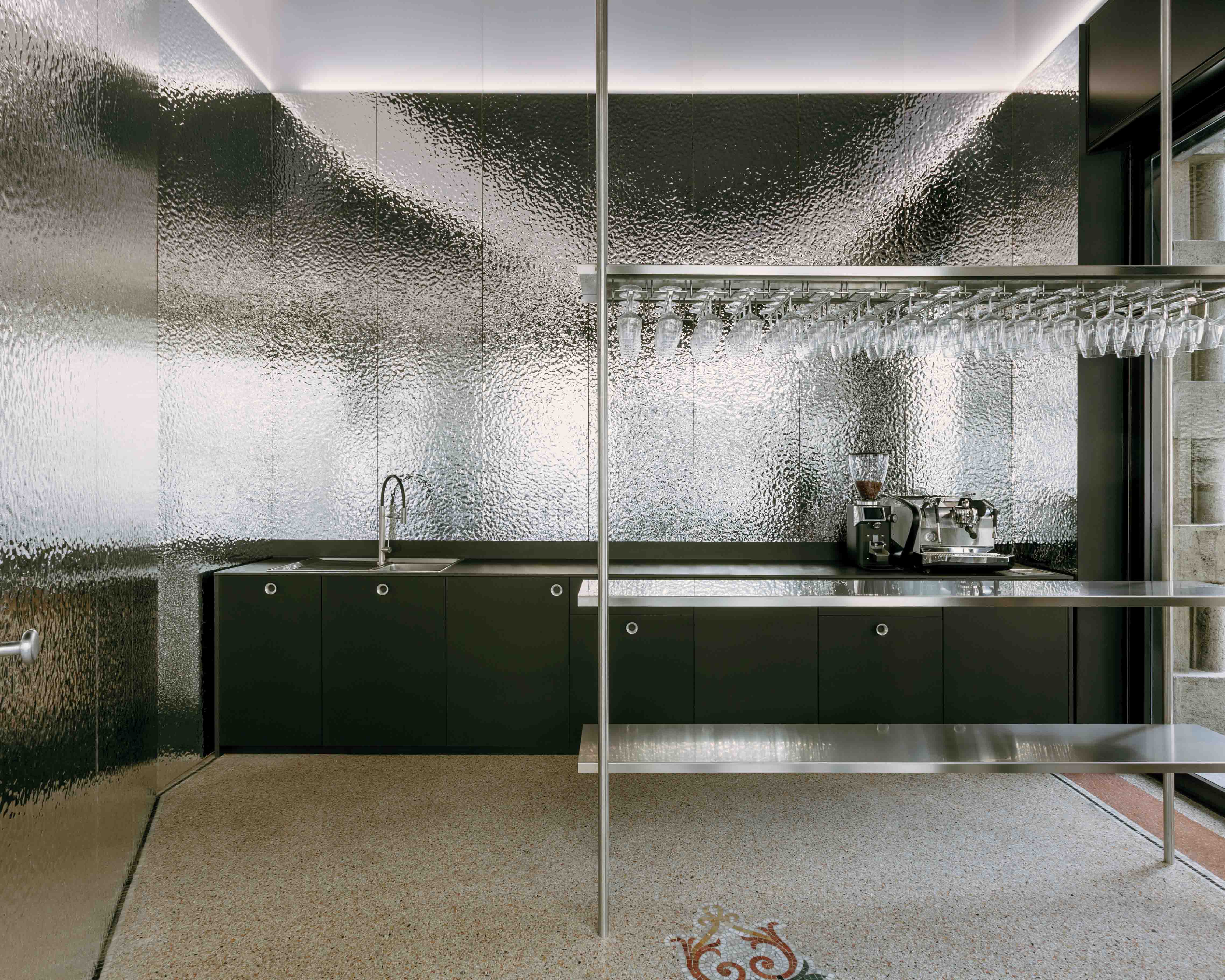 A vertical grid of tubular supports organizes the bar and storefront, making full use of the generous interior height. Through an interlocking mechanism, shelving can transform into seating or display, enabling fluid transitions between hospitality and exhibition.