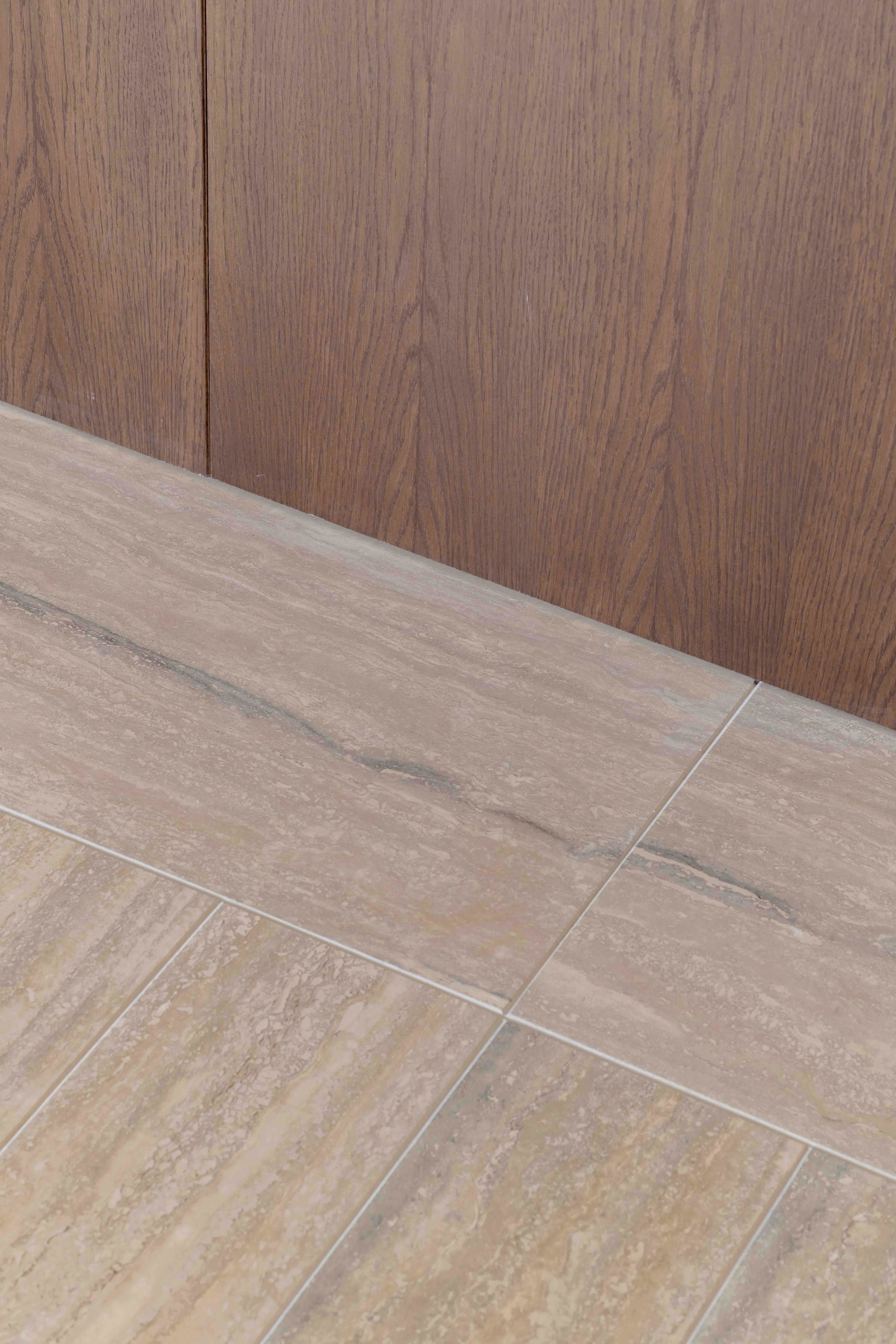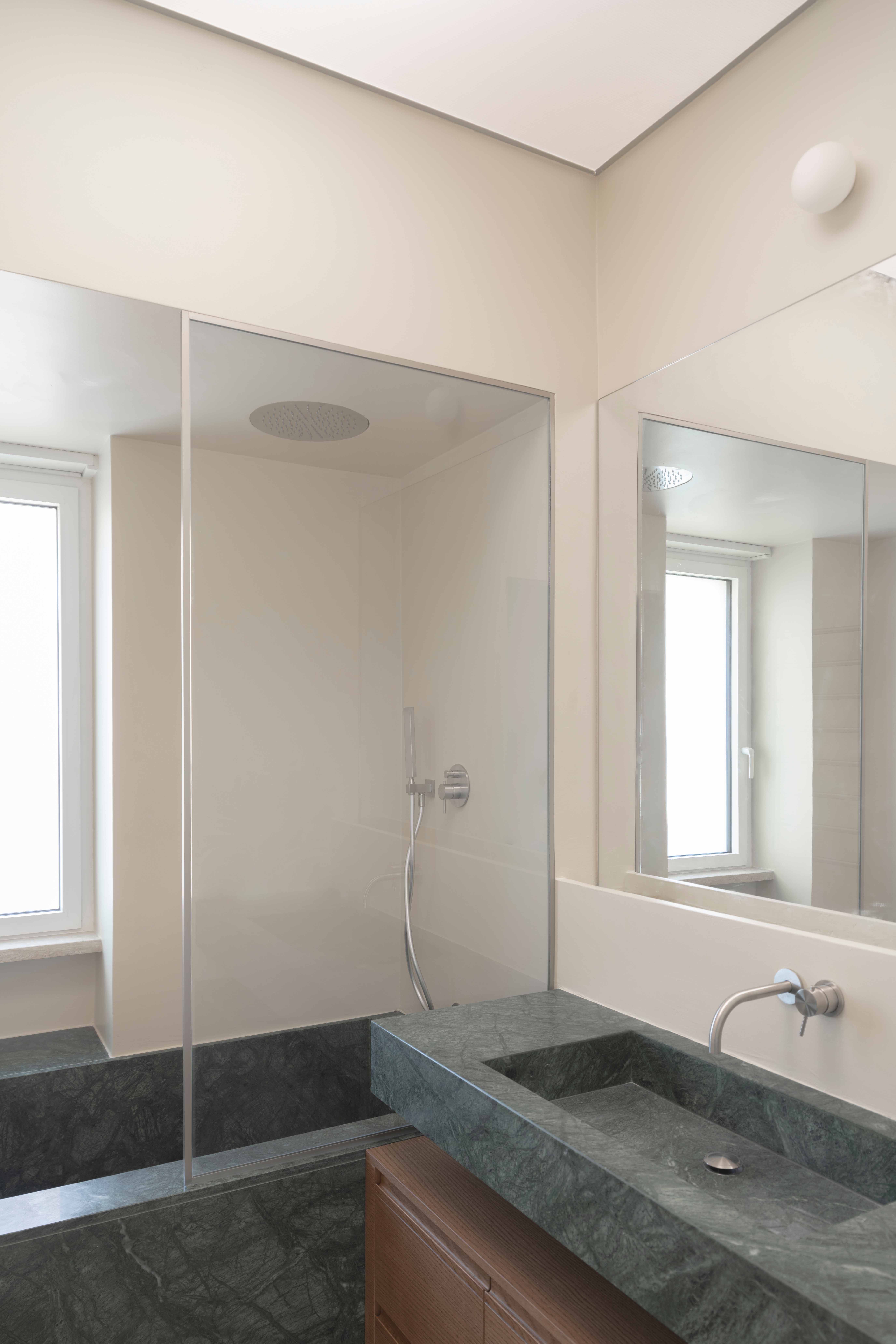 Material articulation plays a central role in reinforcing this new order. Travertine and timber define the project’s material palette, operating simultaneously as threshold and ornament, while grounding the intervention within a longstanding Roman architectural tradition. In the entrance corridor and main living space, the exposed concrete frame traces a cruciform geometry across a floor of alternating cross-cut and vein-cut Roman travertine slabs. In contrast, the bathrooms adopts a more intimate atmosphere, defined by Persian Red and Guatemala Green marble custom designed elements, resin-coated walls, and backlit polycarbonate ceilings.