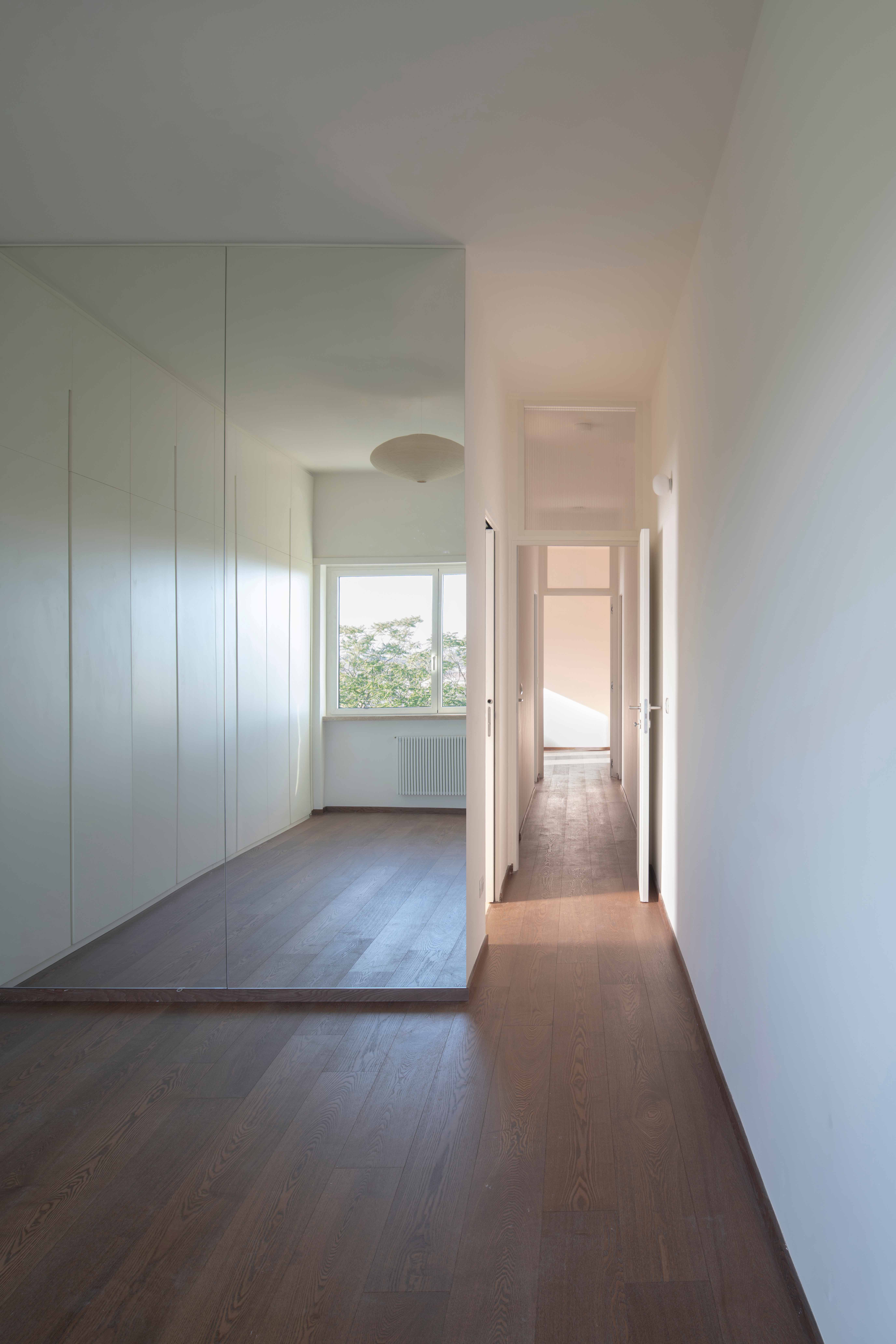 Located on the fourth floor of a 1961 palazzina, the apartment sits along a natural green corridor where dense vegetation and an elevated topography buffer the neighbourhood from the highway and railway infrastructure below. From this privileged position, the apartment opens onto a wide, uninterrupted view of Rome’s northern urban sprawl. Revealing and framing this panorama from within the domestic interior becomes the central ambition of the project, establishing a renewed visual and spatial relationship with the city.