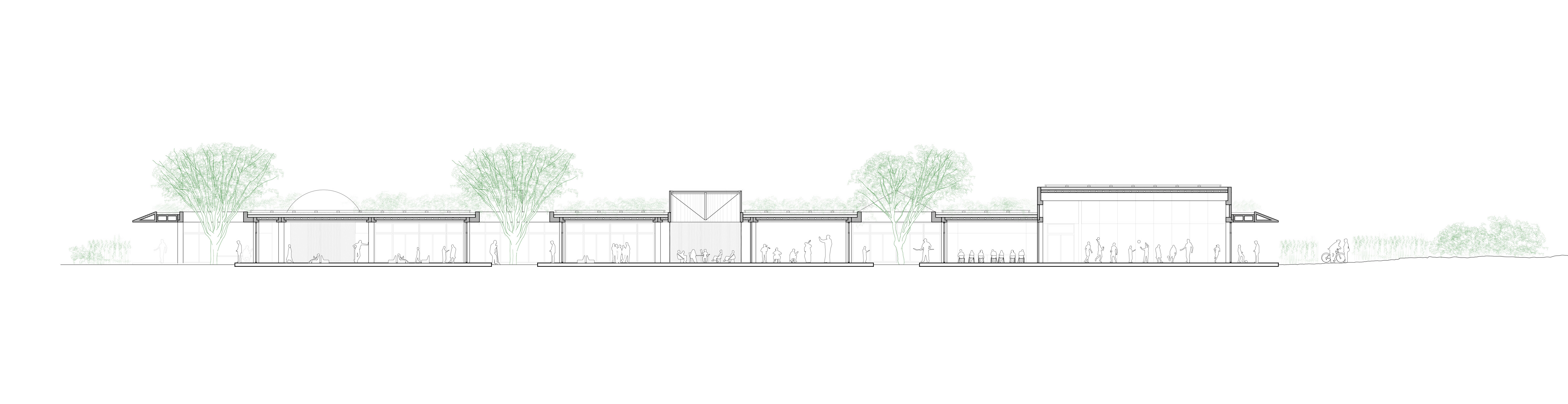 Located in the suburbs of the seaside town of Rimini, this single-storey school emphasizes the longitudinal character of the surrounding countryside in its unfolding along continuous horizontal lines. The flat open landscape in which it lies is designed in order to accentuate the appropriation of outdoor spaces and their transformation into learning environments, within a new vision of teaching methods. The large scale of the field is broken down into thematic areas by a series of linear paths, defining more intimate moments for a wide array of activities including outdoor lectures, recreation, farming, harvesting and pollination. These green corridors eventually penetrate the building, forming lush patios which reach deep into the floor plate and articulate its spatiality, providing extensive visual porosity throughout the whole complex. The educational use of the garden intends to encourage a multisensory approach to learning, liberating teachers’ didactic possibilities and fostering deeper connections between children and the natural realm.
