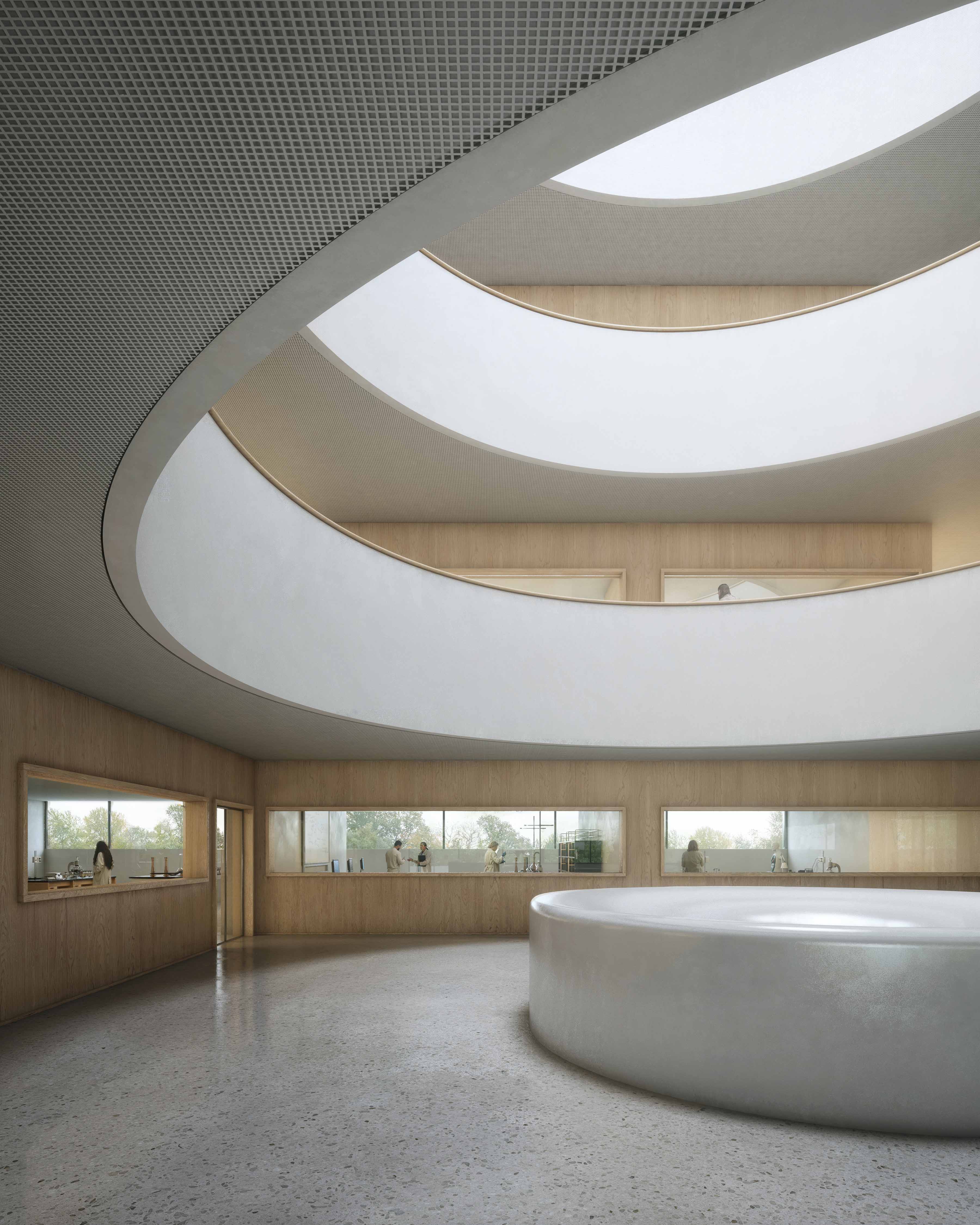 At the heart of the building, a sculptural oculus marks the termination of the full-height atrium, revealing itself upon entry and flooding the space with zenithal light.